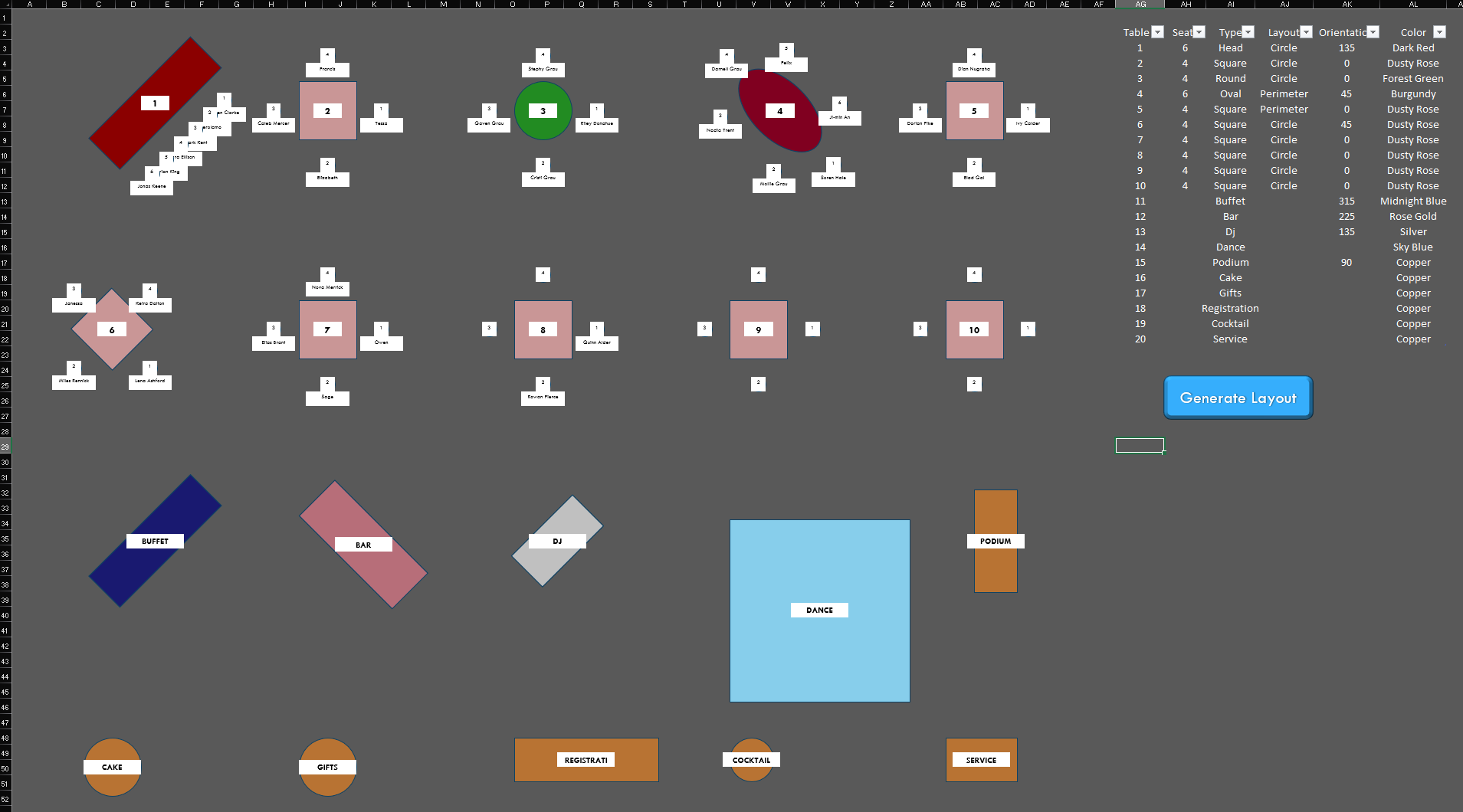 - Venue objects (buffet, bar, DJ, dance floor, podium, etc.)